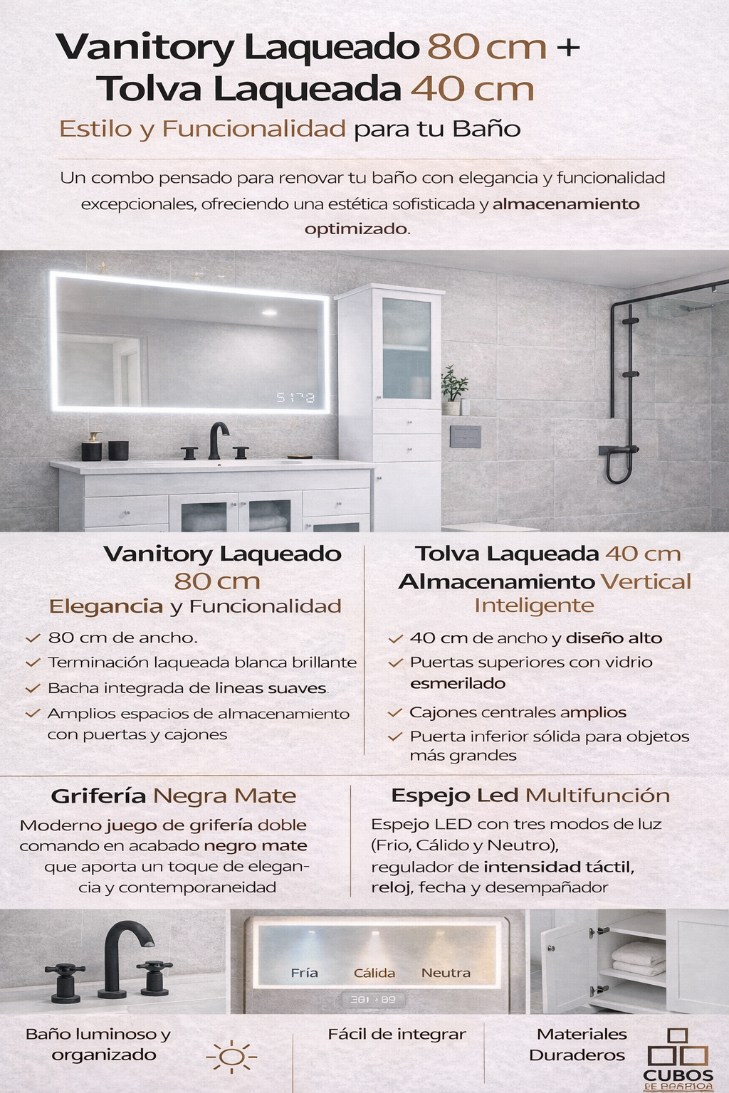 Vanitory 80cm + Griferia + Espejo Led + Tolva 40cm